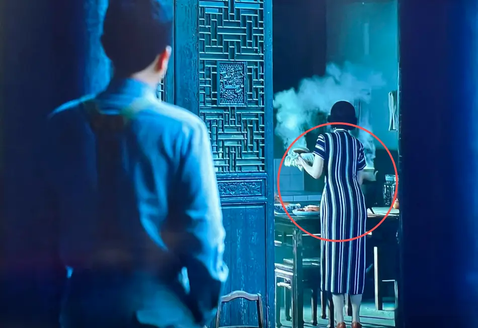 镜头中吴石妻子在厨房做饭时,我们可以清晰看到,她穿了一件条纹式的旗袍。