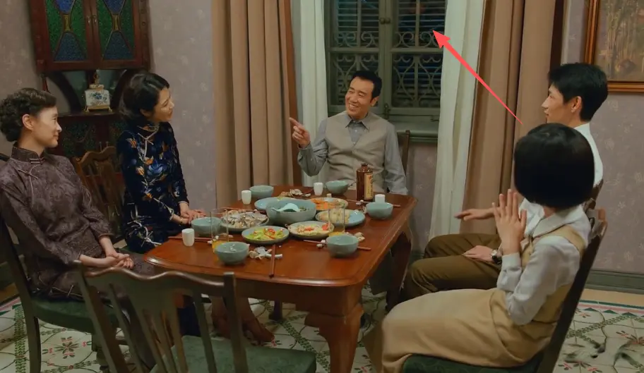 而类似这样的情况,剧中不止出现了一次,吴石等人在家中聚餐时,他身后的窗户上也出现了剧组人员。