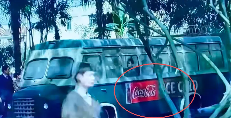 在《沉默的荣耀》这个片段里,镜头中缓缓出现了一辆大巴车,然而车身上却贴了一个可口可乐的广告。